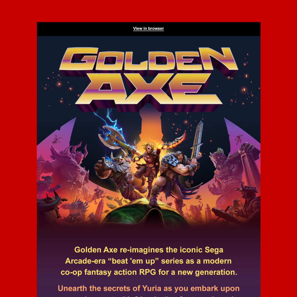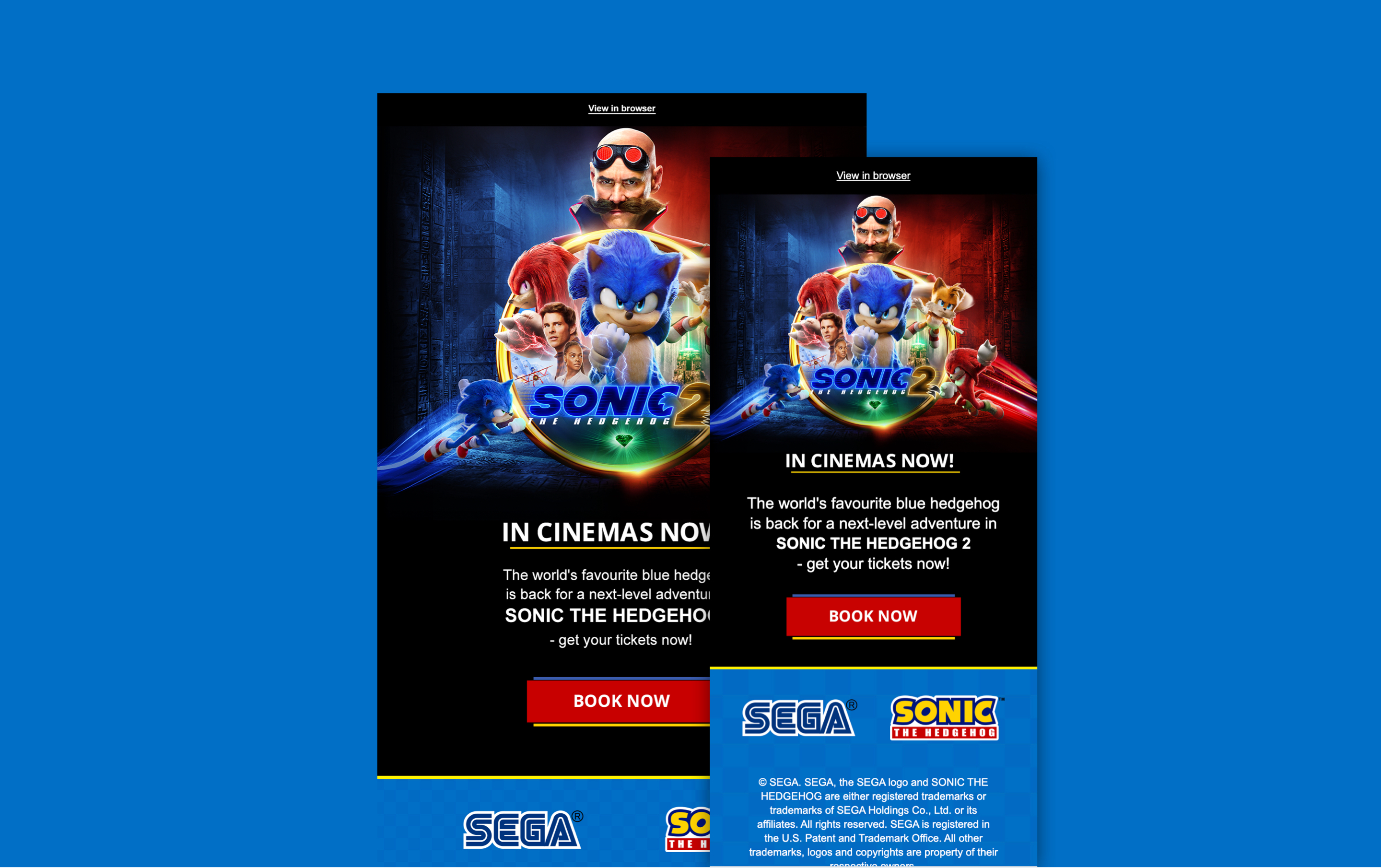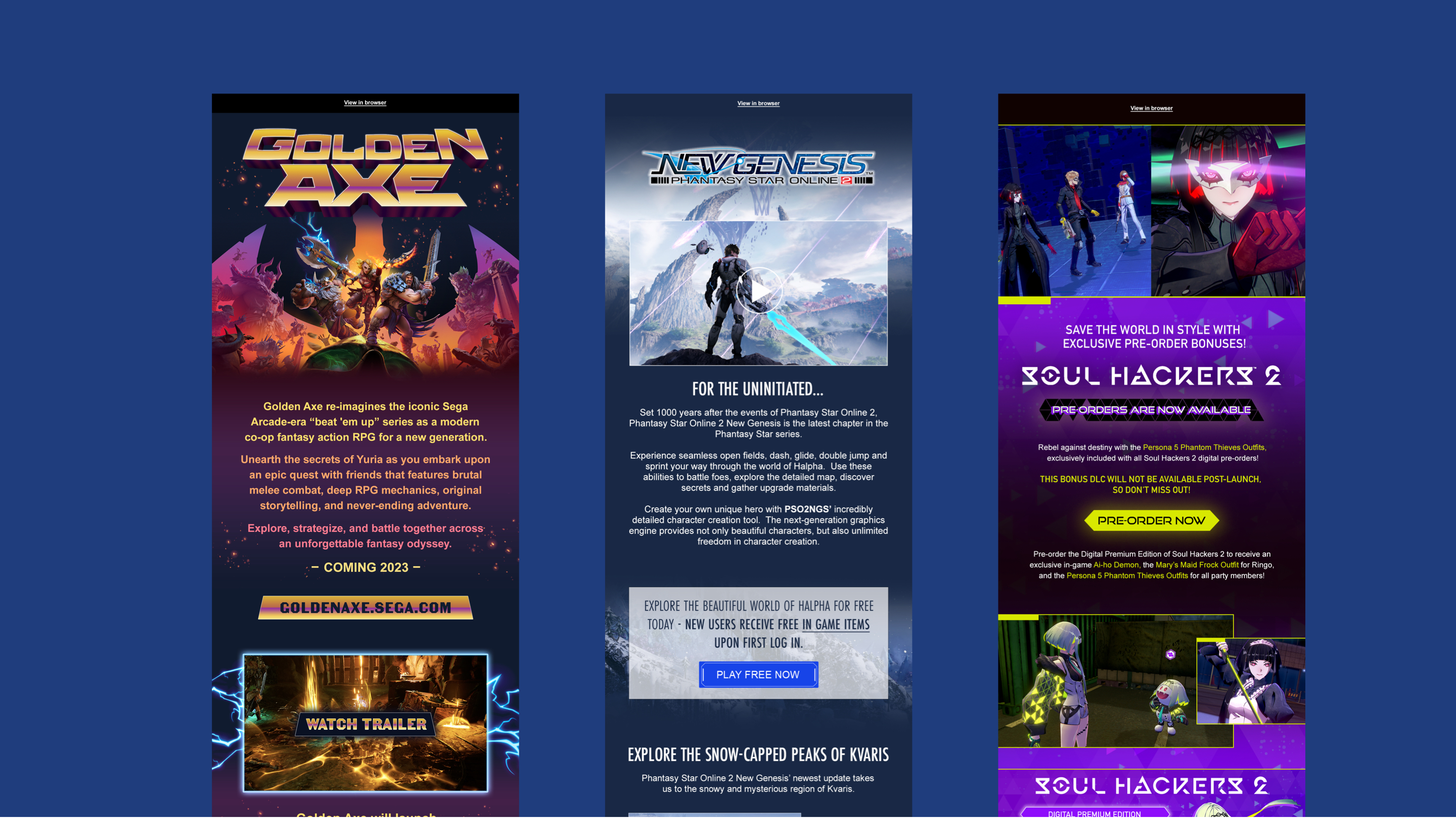SEGA asked us to support their creative services team in designing, building, and testing email templates for campaigns promoting upcoming games releases and competitions. Working on email designs for iconic game titles such as Sonic, 13 Sentinels, Lost Judgement, and many more is a real treat for the whole team.